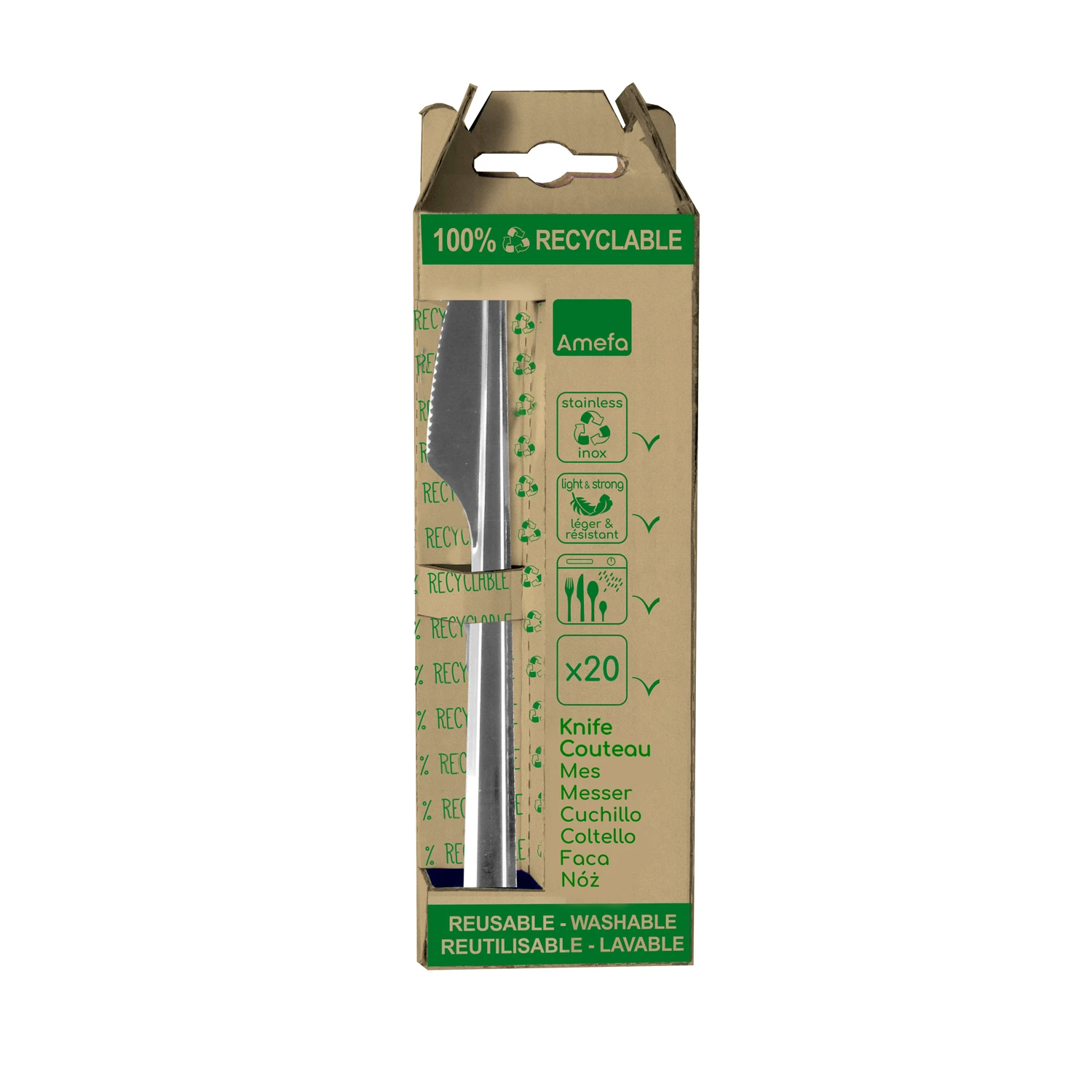 De 20-delige set tafelmessen van Amefa in de serie Leaves is een duurzaam alternatief voor plastic en ander wegwerpbestek. Proactief ontworpen door Amefa, anticiperend op de Europese wetgeving om “single use plastics” uit onze samenleving te verbannen. Leaves is licht en dun maar voelt, eet en ziet eruit als gewoon bestek. Het ontwerp heeft een gebogen, glanzende handgreep die is geoptimaliseerd om het te kunnen stapelen. Omdat het bestek is gemaakt van roestvrijstaal, is het volledig recyclebaar, vaatwasmachinebestendig en geschikt voor veelvoudig gebruik.