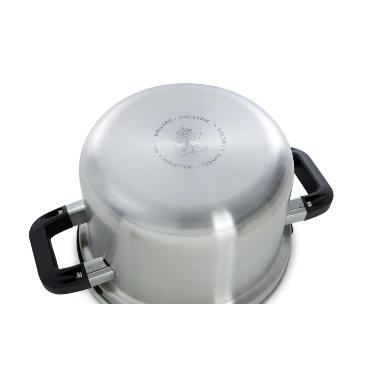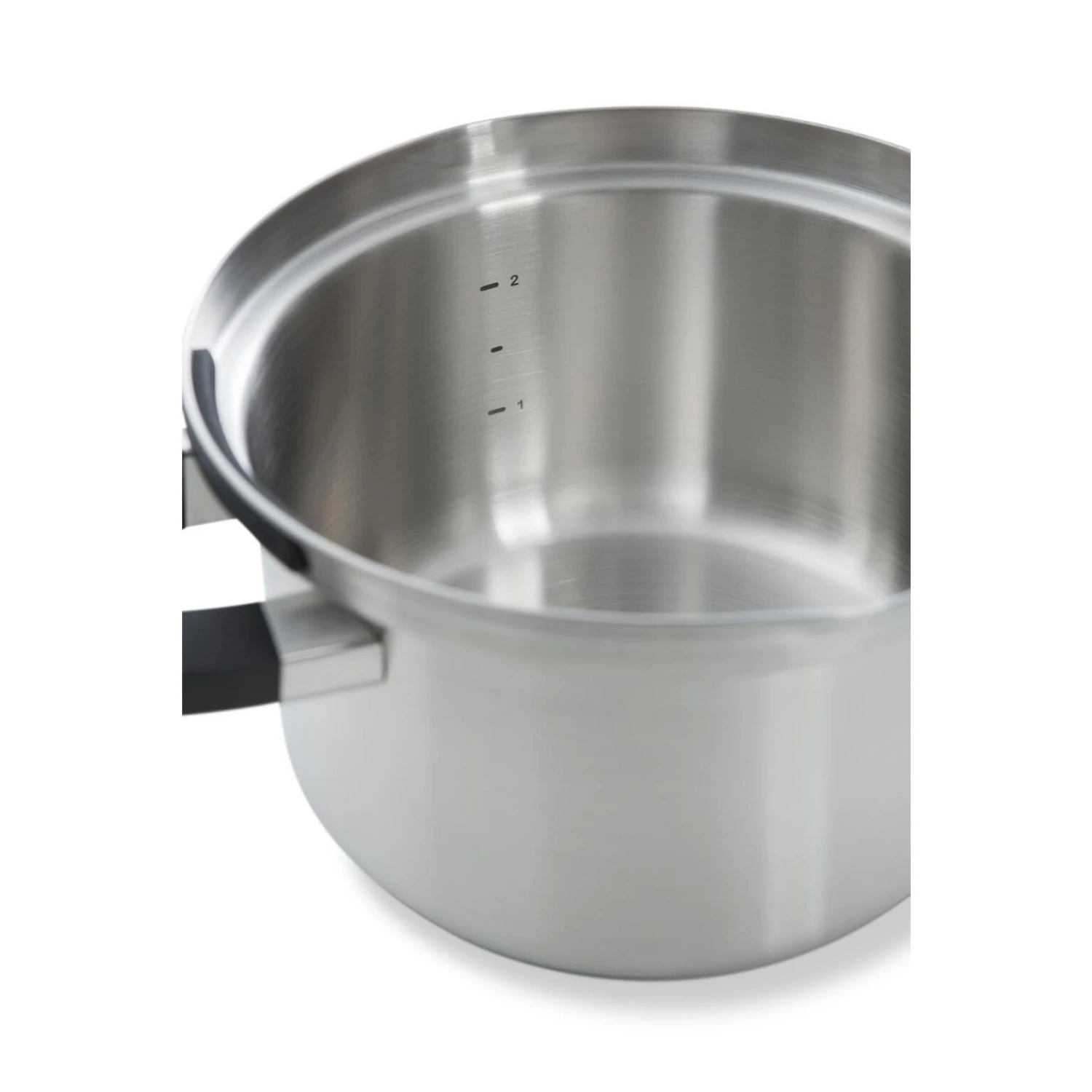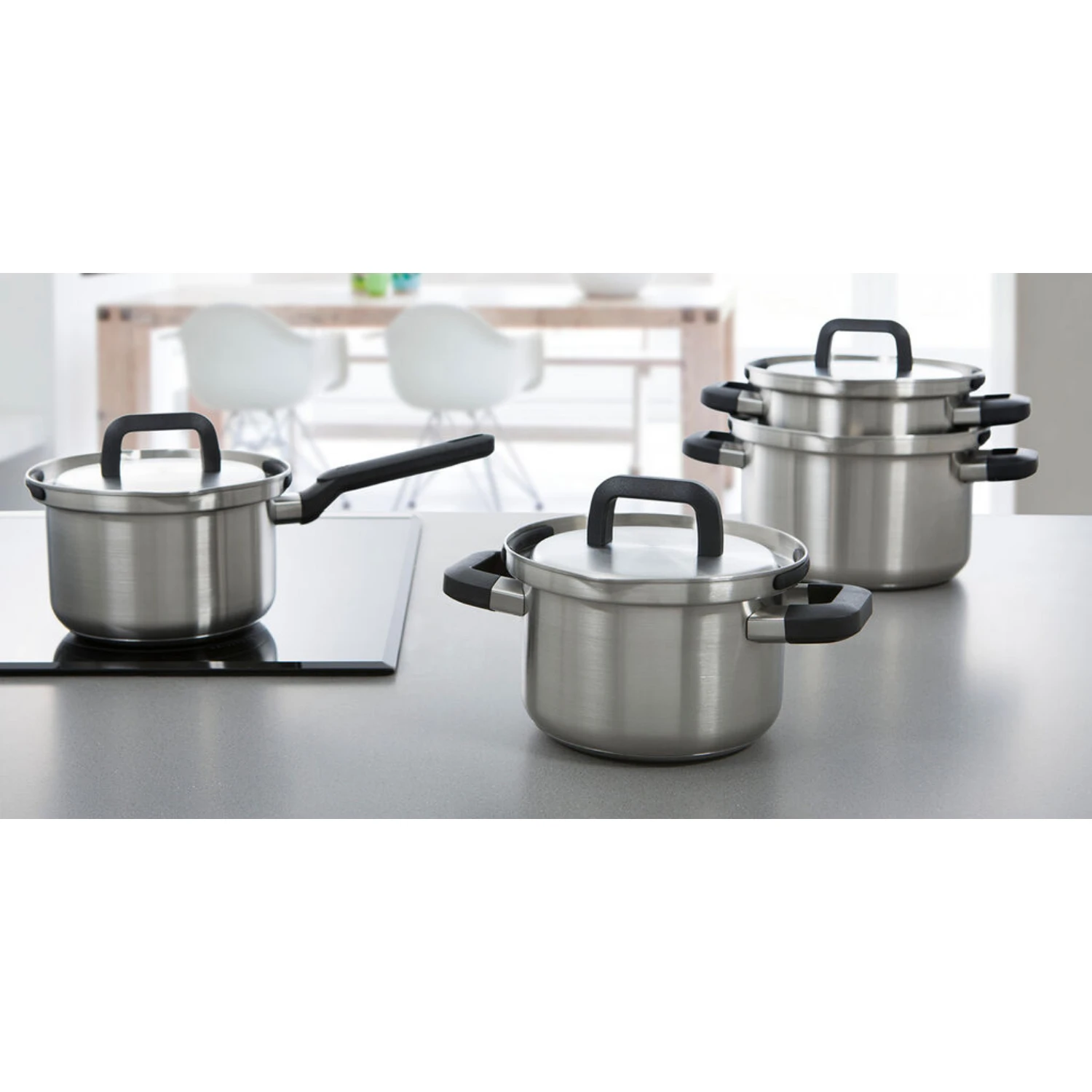 Een stoere rvs pannenset van BK. De BK Flow Cool pannenset is vier delig en bestaat uit 3 kookpannen met deksel en een steelpan met deksel. De BK Flow Cool kookpannen zijn voorzien van een veilig en uniek afgietsysteem. Met een simpele kwartslag draai, vergrendeld de deksel onder de zwarte siliconen stoppers. Zo kun je op een veilige manier met twee handen afgieten.